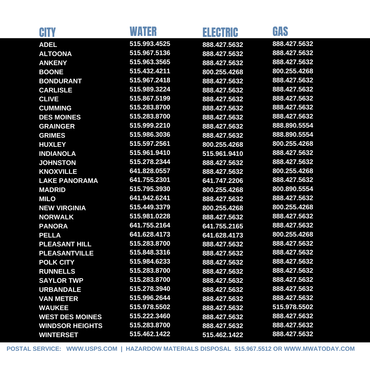 Setting up your utilities is a key step in the moving process. Attached are all key phone numbers by city.